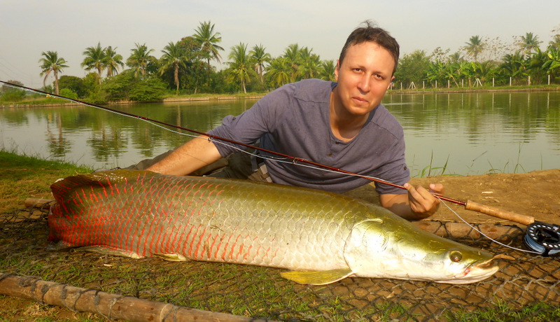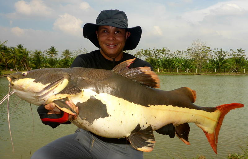 Le lac de Ratchaburi où nous passerons nos deux derniers jours de pêche est très différent : déjà beaucoup plus grand, un cadre agréable et naturel, ce qui ne gâche rien et nous rend la pêche beaucoup plus intéressante. Ici on peut pêcher à la mouche, au leurre et au vif l’après-midi. Les Redtail Catfish et Chao Phraya Catfish sont toujours très présents et c’est un vrai plaisir de les combattre avec une petite canne de 30 lbs de 10/50 gr ou à la mouche pour voir sortir 200 ml de backing à toute allure, une vingtaine de minutes à deux heures sont nécessaire pour épuiser ces gros minous. Les touches ici sont assez régulières bien qu’un temps d’adaptation soit nécessaire pour trouver le bon leurre, la bonne vitesse, la bonne technique; les guides sont là pour nous donner quelques conseils. Laurent nous sort le premier Pacu, apparenté au piranha mais herbivore ou omnivore, puis c’est au tour de Nicolas de faire le sien. Ils adorent les morceaux de bananes piqués simplement sur un 7/0 posé sur le fond; les Redtails Catfishs viennent aussi participer.